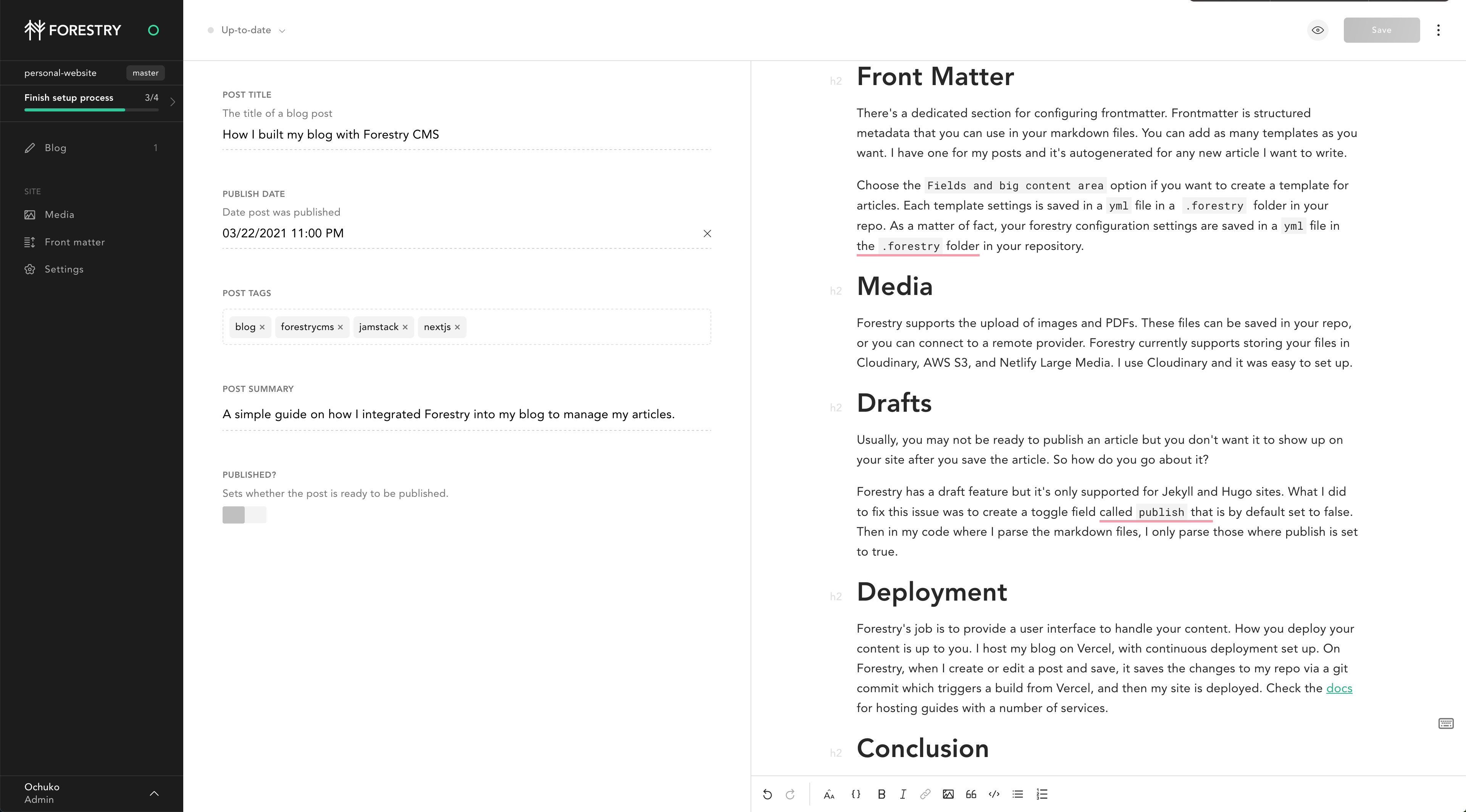 Forestry gives you a good WYSIWYG editor for writing content. In the image below, on the left is the post's metadata, defined when I configured my frontmatter. On the right is the content body.