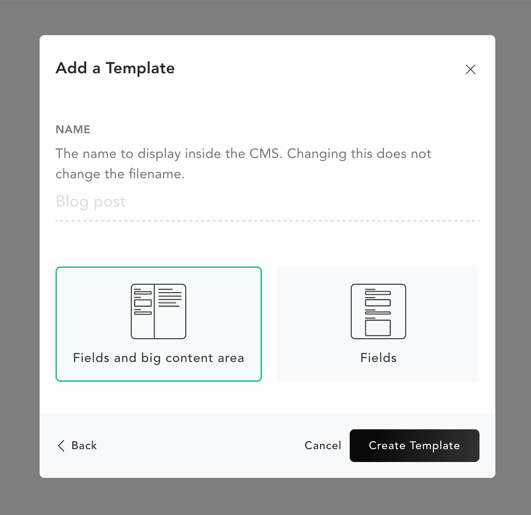Choose the Fields and big content area option if you want to create a template for articles. Each template settings is saved in a yml file in a .forestry folder in your repo. As a matter of fact, your forestry configuration settings are saved in a yml file in the .forestry folder in your repository.